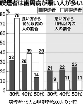禁煙や分煙が広がる中でも、女性や未成年の喫煙は増えています。当歯科診療所でも、これまで「喫煙は口腔内に悪影響を及ぼす」と患者に知らせてきましたが、なかなか喫煙者は減りません。そこで受診者を対象に、喫煙者と非喫煙者の歯周病の進行度を比較調査しました。