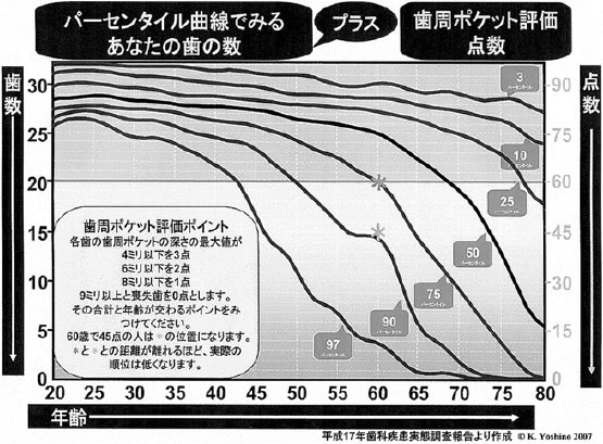 パーセンタイル曲線とは、自分の残存歯と歯周病の程度が、同年齢の一〇〇人の中で良い方から何番目かがわかる簡単な図表です。今後の進行の予測もでき、対策を立てることができます。