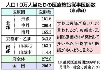 「驚いたのは、北部には開業医がほとんどいないこと。例えば、六つの町が合併してできた京丹後市。旧弥栄町(やさかちょう)には病院が一つだけで、開業 医は一人もいません」と門さん。府北部の広大な面積に点在し、医療をささえる公的病院をつぶしてはなりません。