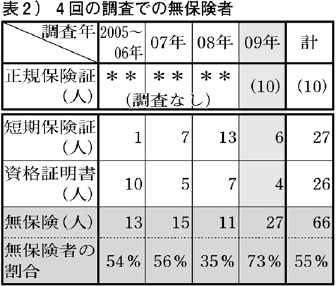 保険証の有無や種別では、無保険が二七人でした。過去三回と比べて無保険が多くなっているのが特徴です。国保(短期証)が六人、国保(資格証明書)が四人となっています(表2)。
