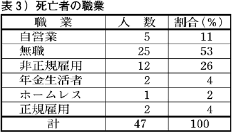 報告書では、(1)解雇や退職後に国保に加入していない、(2)健康保険加入の義務のない働き方(パートなど)、あるいは雇用主が健康保険に加入させな い、(3)外国人労働者、(4)国保に加入しているが、保険料の滞納で保険証が渡されないなどを挙げています。国保料の高さが原因です。今回の事例には無 職、非正規雇用が多くいました(表3)。