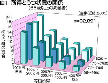 所得格差が健康格差につながっていることは直感的に理解しやすいでしょう。私たちの調査では、お金持ちの方がうつ病が少ない(図1)、要介護状態になりにくい、死亡率が低いことがわかっています。WHO(世界保健機構)から報告書が出ていますし、民医連の現場でも実感していることでしょう。