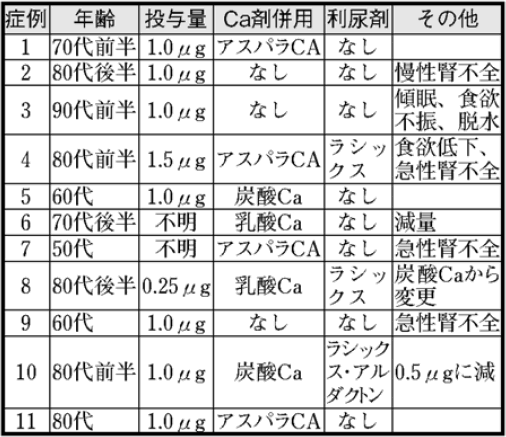 上記の症例からは、年齢と投与量、腎機能、併用薬に問題がありそうです。75歳を超えた高齢者が8例で、1日投与量が判明している7例中、1例を除き 1μgを超えています。