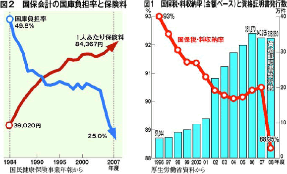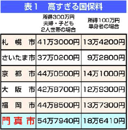 門真市の国保税は高く(表1)、収納率は八〇%を割り込み、全国ワースト二位です(二〇〇七年度)。しかも滞納率が約七〇%(二〇〇九年)。一年間で保険税を一円でも滞納した世帯を総加入世帯数で割ったもので、払えない世帯の多さを示しています。
