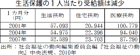 静岡大学の布川日佐史教授が、提言の問題点を解説。いま日本の二〇〇〇万人が貧困状態にあり、生活保護未満の収入で暮らす世帯が五九七万世帯という数を 示し、「貧困の拡大に生活保護の増加が追ついていない。受給者が増えすぎという認識では対応を誤る。むしろ受給者を二倍に増やす対策をとるべき」と話しま した。さらに、医療扶助については一人あたりの受給額は減少していると紹介しました(表)。