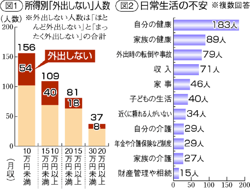 まったく外出しない人は一一・四%、ほとんど外出しない人は二〇・二%にのぼり、高齢者のみの世帯や低所得者ほど家に閉じこもりがちです(図1)。八割 が将来に対する不安を抱え、まったく相談相手がいない人が一割いました。切実な声として「話し相手がほしい」「一人で寝ていて、急に具合が悪くなったら不 安」などがありました。