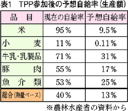 農林水産省は昨年一〇月、日本がTPPに参加した場合、食料自給率(熱量ベース)が四〇%から一三%に減少し(表1)、三五〇万人の雇用が失われると試算しました。日本の自給率は国際的に極めて低い水準です(図1)。既に国内の農家はあい次ぐ減反や牛肉・オレンジの輸入自由化で疲弊しており、これ以上海外から安い農産物が入ってくれば、大きなダメージを受けます。
