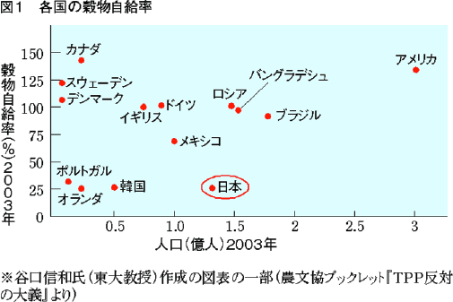 日本の穀物自給率(25%)はOECD30カ国中26番目と低位のうえ、約1憶 3000万人の人口を抱える。同じく自給率低位の韓国は人口が日本の1/3、オランダは1/8、ポルトガルは1/13。日本は人口が多いうえ食糧を海外に 依存しており、ひとたび非常事態が起きれば調達は著しく困難になる。