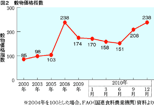 2008年の高騰はトウモロコシなど投機マネーの操作が主因だったが、2010年の高騰は災害による不作が主因だった。世界が穀物不足なのにTPP参加で農業を潰すのは大問題