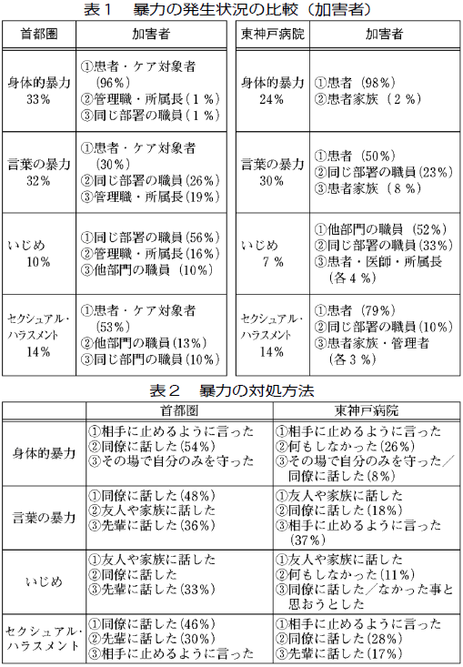 暴力の発生状況の比較(表1)…(1)言葉の暴力は、当院では患者からが多く、首都圏のような管理職・所属長からは少ない。(2)いじめは首都圏と違い、他部門職員からが半数以上と分かりました。