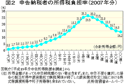 大企業や大金持ちの納税額を引き下げ、その埋め合わせを消費税で行うのが財界や政府が目指す方向。左図2は所得別の税負担率。所得税収入が減っているの は最高税率が70%(1986年)から現在の40%にまで大幅に引き下げられたため。また、株などの収入には10%しか課税されないなど金持ち減税がさま ざまある。
