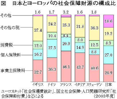 また、欧州の社会保障財源は消費税を中心にまかなわれているという事実もない。日本と欧州各国の財源を比較すると(図)、「事業主保険料」と「その他の 税(所得税と法人税)」の拠出割合が欧州では高い。欧州の社会保障は企業とゆとりある個人がしっかりささえている。