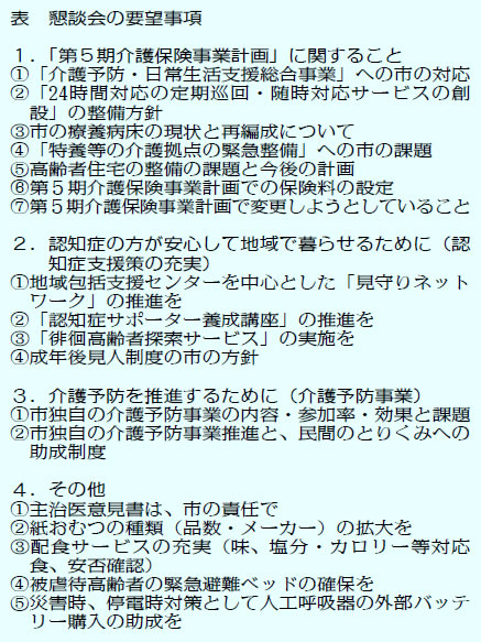 民医連外の介護事業所からは「市の考えを直接聞くことができる場があることに驚いた」「行政に意見を言えるなんて、びっくり」「介護保険の問題点がわかって、勉強になった」との声が。