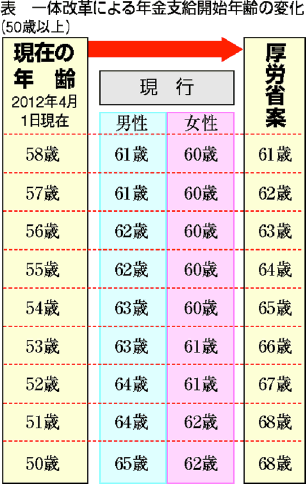 「一体改革」成案は、年金の支給開始年齢を現行から六八~七〇歳に引き上げるとしました。 「一歳引き上げるごとに、五〇〇〇億円程度の公費が縮小できる」と試算しています。厚労省案はその第一歩として六八歳までの引き上げを提案。現在五一歳以 下の人は、六八歳にならないと年金をもらえなくなります(表)。