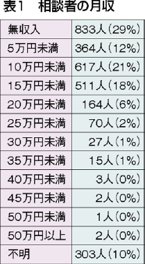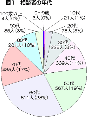【年齢】相談者の年齢別では六〇代が最多の二八%。四〇~六〇代で約六〇%を占めました(図1)。七〇代以上も三〇%あり、「壮年期に厳しく、老いてもなお厳しい」状況が続いています。九〇代、一〇〇歳以上といったケースもありました。