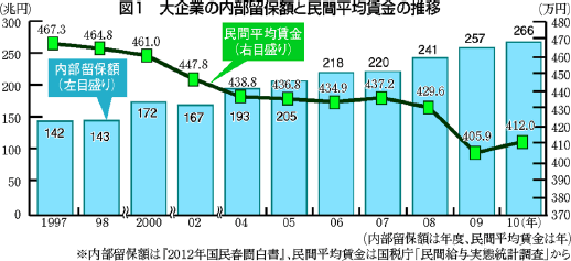民主党は完全に「構造改革」路線に逆戻りしてしまいました。自公政権と同じく「大企業とア メリカ優先」、「国民生活後回し」をひた走っています。労働者派遣法の見直しや、後期高齢者医療制度廃止などの国民との約束には背を向けたまま。一方で大 企業には特権的な減税や証券優遇税制などで優遇し、一九九七年に一四二兆円だった内部留保は、リーマンショックがあったにもかかわらず二〇一〇年には二六 六兆円に!