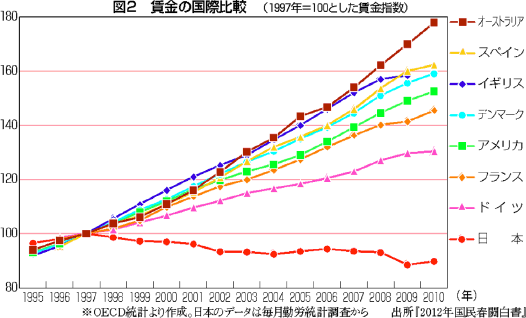 この間、民間平均賃金は四六七・三万円(九七年)から四一二万円(二〇一〇年)と五五万円も下がりました(図1)。長期間賃下げを続けているのは、欧米諸国と比べても日本だけです(図2)。非正規労働者は全体の三四%で、九〇年以降最多。女性は過半数の五四・四%が非正規雇用です。