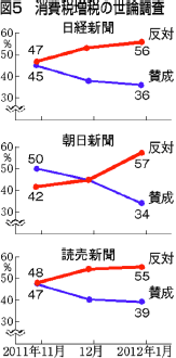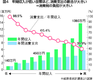 消費税は、被災者も負担します。五%上がれば、被災三県では五三〇〇億円の負担増で、現在の住民税四〇五〇億円を上回ります。逆進性の強い消費税は、低所得者ほど負担の重い不公平な税です(図4)。これを引き上げることで、野田首相が言うように「希望」を取り戻せるとは、国民も考えていません(図5)。