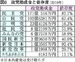 野田首相は「政治家自身が身を切る姿勢が不可欠」として、衆院比例定数を八〇議席減らすとしました。国会の議席は民意を国政に反映するもの。「身を切 る」なら、国民の税金を各党で山分けする「政党助成金」三二〇億円(図6)こそ、まず廃止すべきです。これは国会議員四五七人分の経費に匹敵します。仮に八〇人減らしても、政党助成金の六分の一程度(五六億円)にしかなりません。