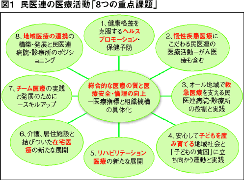 今期(第三九期)の運動方針は、「総合的な医療の質の向上」と「医療活動の八つの重点課題」(図1)を、医療活動の二つの柱に位置づけました。二つの柱は積極的に受け止められ、貧困と健康格差、地域医療のあり方や医師養成について、各地で活発な議論が行われました。総じてこの二年間で、それぞれ一定の前進があったと感じています。
