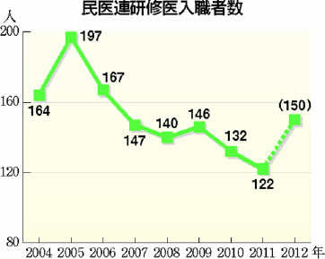 民医連はこれまで、独自の医師研修で四〇〇〇人以上の医師を育ててきました。しかし、 二〇〇〇年初頭に四五〇人前後だった民医連の奨学生数は、〇九年に三六三人に減少。研修医のマッチング数も〇四年の二一九人をピークに〇九年は一四八人、 また、後期研修へ進む割合も減っていました。