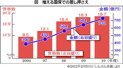 滞納世帯に対する人権無視、機械的な財産の差し押さえも目立ちます(図)。差し押さえ世帯数は〇六年九・五万世帯が一〇年一八・七万世帯に、金額も三九〇億円から七三二億円とほぼ倍増です。