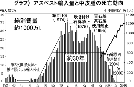アスベストばく露による悪性中皮腫の発症までの潜伏期間は二五~五〇年です。今後、国内で使用量が多かった時期の潜伏期間が終わるため、新たな悪性中皮腫の発症が増加することは確実です(グラフ)。