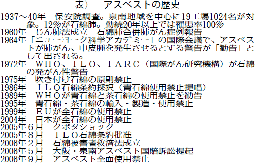 国際的には、一九六四年に「アスベストが肺がん、中皮腫を発生させる」とする警告が「勧 告」として出され、七二年にはWHO(世界保健機関)やILO(国際労働機関)が石綿の発がん性を警告していました。にもかかわらず、日本では、五〇年代 半ば~七〇年代初頭までの高度経済成長期、八〇年代半ばから九〇年代前半までにアスベストが大量に輸入され、使用されました。日本政府がすべてのアスベス トの全面使用禁止を決めたのは〇六年。EUの決定の七年後でした。対応は遅れています(表)。