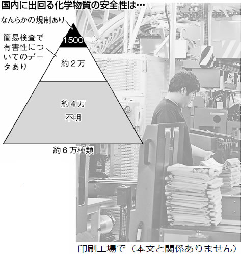 国内で使われている化学物質は約六万種類(図)。その発がん性を確認する機関は国内に一つしかなく、結果が出るまで に最低五年はかかります。また、特定の物質の危険性が判明して規制されても、すぐにそれに代わる別の化学物質が作られます。成分や毒性はほとんど変わら ず、「規制されていない」という理由で出回るのです。