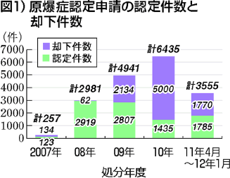 新基準に希望をもった多くの被爆者たちが、ようやく申請を行いました。が、原爆症の認定件数は確かに増えたものの、却下件数も年々増えています。申請者 のほとんどが認定された二〇〇八年度と変わって、二〇一〇年には却下件数が認定件数をはるかに超える状況に(図1)。