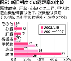 疾患別では、悪性腫瘍や新しく加えられた心筋梗塞の認定率は高くなりましたが、甲状腺機能低下症や造血機能障害では旧制度よりも認定率が大きく下がっています(図2)。また、集団訴訟で認定された疾病が、新基準の下では却下されるなど(図3)、国の言う「積極認定」とは言いがたい現実があります。