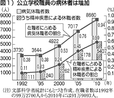 この二〇年で、教職員の病気休職、なかでも精神疾患による休職者数は急速に増えています。二〇一〇年の休職者は約一%で、うち精神疾患で休職する人の割合は、一九九二年の〇・一一%から二〇一〇年の〇・五九%へ、五倍以上に激増しています(図1)。
