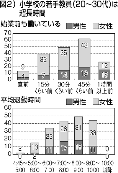 初任者はじめ若手の教員は、学校を離れての研修やレポートの提出を頻繁に求められ、二〇~三〇代の教員で特に勤務時間が長くなっています(図2)。以前に比べ、教員同士の自主的な研究会や、保護者や地域との教育懇談会なども開かれなくなっています。