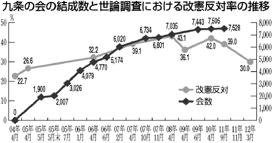 二〇〇四年に始まった九条の会は、改憲を阻む大きな役割を果たしました。読売新聞の世論調査によれば、〇四年に改憲賛成の意見は六五%、反対は二二%だった。それが九条の会の結成数増加とともに改憲反対の意見が増え(表)、〇八年には反対が賛成を上回りました。世論の変化により、当初は改憲を志向した民主党の政策が変わりました。