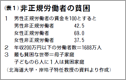 もうひとつの問題が、非正規労働者の増加です。正規労働者に比べて低賃金で、貧困状態に置かれています(表1)。 ILO(国際労働機関)は「Decent Work for All」を提唱し、(1)人間らしく生活できる十分な賃金、(2)社会保障により、労働者と その家族が保護されている、(3)労働基本法により、労働者の権利が保障されている、(4)男女平等が実現されている、と規定。非正規労働者はいずれの項 目も十分ではなく、そのために健康を阻害されています。