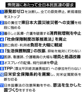 このねじれを正常に戻すのが、今回の総選挙です。多くの個人が政治的な問題で自分の意見を訴え、直接行動に出た時期は、日本の近現代史を遡ってもそう多 くありません。「民意を無視したのは誰なのか、どの党なのか。しっかり峻別して、民意が実現する国会をつくることが今回の総選挙だ」と、全日本民医連理事 会は全国の民医連の仲間に呼びかけました。
