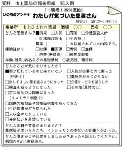 薬代の未収や自費の処方箋など“気になる患者”は必ず報告―。巾上(はばうえ)ひまわり薬 局(長野県松本市)は、薬剤師や事務がオリジナルの報告用紙(資料)に事例を記入、隣接する松本協立病院と協力し、安価な薬への処方変更や公費制度を使っ て、経済的理由による治療の中断を防ぐ“キニカン”活動にとりくんでいます。