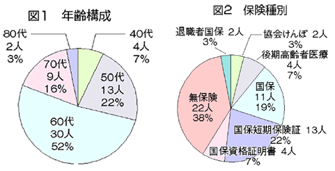 日本は「どこでも、誰でも保険証一枚で同じ医療が受けられること」が、すべての国民の権利 として保障されています。しかし、今回の調査では正規の保険証を持っていなかった無保険、資格書、短期証の層が六七%にのぼりました。その雇用状況は非正 規が三一%、無職が三九%でした。