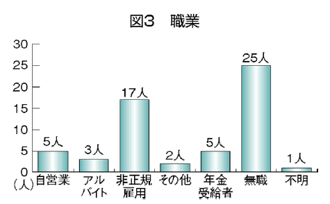 雇用状況は無職が四三%、非正規雇用が二九%、自営業と年金生活者がそれぞれ九%でした(図3)。非正規雇用、失業、低年金・無年金など、経済的基盤の弱い層に集中しています。
