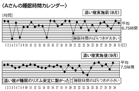 その結果、ばらつきが大きく、リズムが乱れていた睡眠時間が、添い寝をすると安定するようになりました(図)。平均睡眠時間も、実施前の六・七五時間から実施後七・五時間に長くなりました。