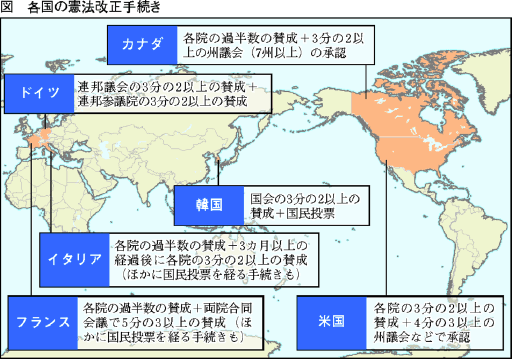 外国の憲法も同様で、特別な多数での発議に加え、国民投票などの手続きを課しているというのが主流です(図)。改憲勢力はこのハードルを過半数に低めようというのです。そうなれば、政権が変わるたびに都合よく変えられ、憲法が不安定になりかねません。
