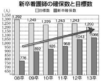 今年の新卒看護師確保数は一〇六六人(昨年は一〇三四人)。このうち福岡が一二一人、東京 が一一八人と大都市圏で二割以上を占めました。愛知(七〇人)、北海道(五六人)、大阪(五四人)、長野(五二人)も目立ちます。目標を達成したのは一三 県連。福岡はもともと九二人と高い目標を超過達成しました。一方、確保ゼロは三県連でした。