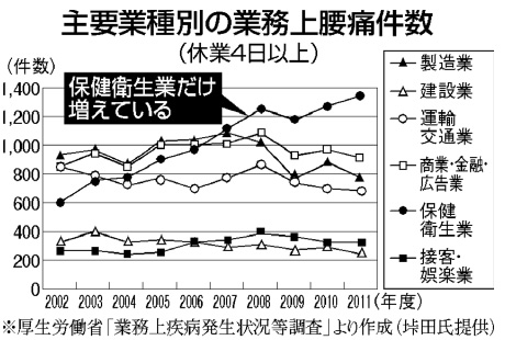 厚労省の統計では、二〇一一年に休業四日以上の腰痛は四八二二件で、業務上疾病(労災)の六割。しかし、徐々に痛みが進行する非災害性は五六件に過ぎません。