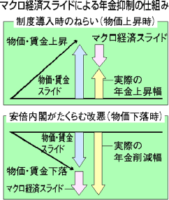 【給付額引き下げ】…年金給付額は昨年の法改正で、すでに今月から一%、三年で二・五%削減すると決まっています。そこにマクロ経済スライドの見直しが提案されました。