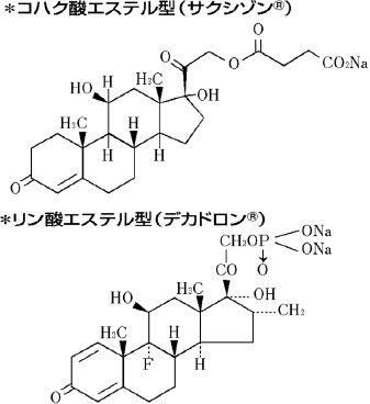 コハク酸エステル型のステロイド注射薬(サクシゾン(R)、水様性プレドニン(R)、ソル・メドロール(R)など)は、アスピリン喘息をはじめ、 アレルギー素因のある患者に投与すると、過敏反応を誘発することがあります。17員環のCOONa(⇒COO-)が体内のタンパク質と結合することによ り、抗原として作用してしまうことが原因と考えられています。