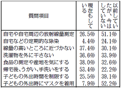放射線量測定や除染、うがいなど被曝を避けるための行動を聞いたところ、「以前はしていたが、今はしていない」との傾向が強く表れました(表)。自由回答欄には「放射能を考えることに疲れた」との記述も。事故直後は意識的だった行動も、二年が経過して関心を持ち続けることに疲弊している様子もうかがえます。