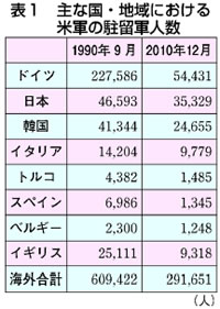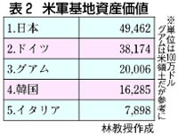 冷戦終結以降の一九九〇年代、世界各地の米軍基地は、面積・人員ともに大きく減っています(表1)。そんな中、日本は米軍基地の面積も人員も維持。米軍人が一万人以上駐留しているのはドイツ、日本、韓国のみ。基地として使わせている土地の資産価値は日本がトップです(表2)。