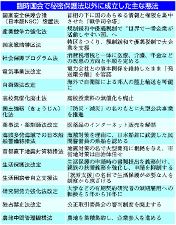 特定秘密保護法に象徴されるように、昨年一年間の政治情勢はひと言でいえば「政府の暴走」と表現できそうです。数を力に憲法の基本原則を否定する悪法を次々と成立させました(表)。