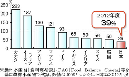 「安保条約第二条の目的を達成する」との日米合意で、一九六一年に「日米貿易経済合同委員会」が発足。同委員会は七〇年代以降、麦や大豆、オレンジ、牛 肉、米など農産物に対して次々と“自由化”の圧力をかけ、日本の農業は大打撃を受けました。食料自給率はいまや、先進国最低の三九%に落ち込んでいます(図)。