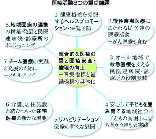 私たちは貧困と格差に立ち向かう医療活動の前進をめざし、健康権・生存権の実現を医療活動の中心に据え、「総合的な医療の質の向上」と「医療活動の八つの重点課題」(図)にとりくんできました。